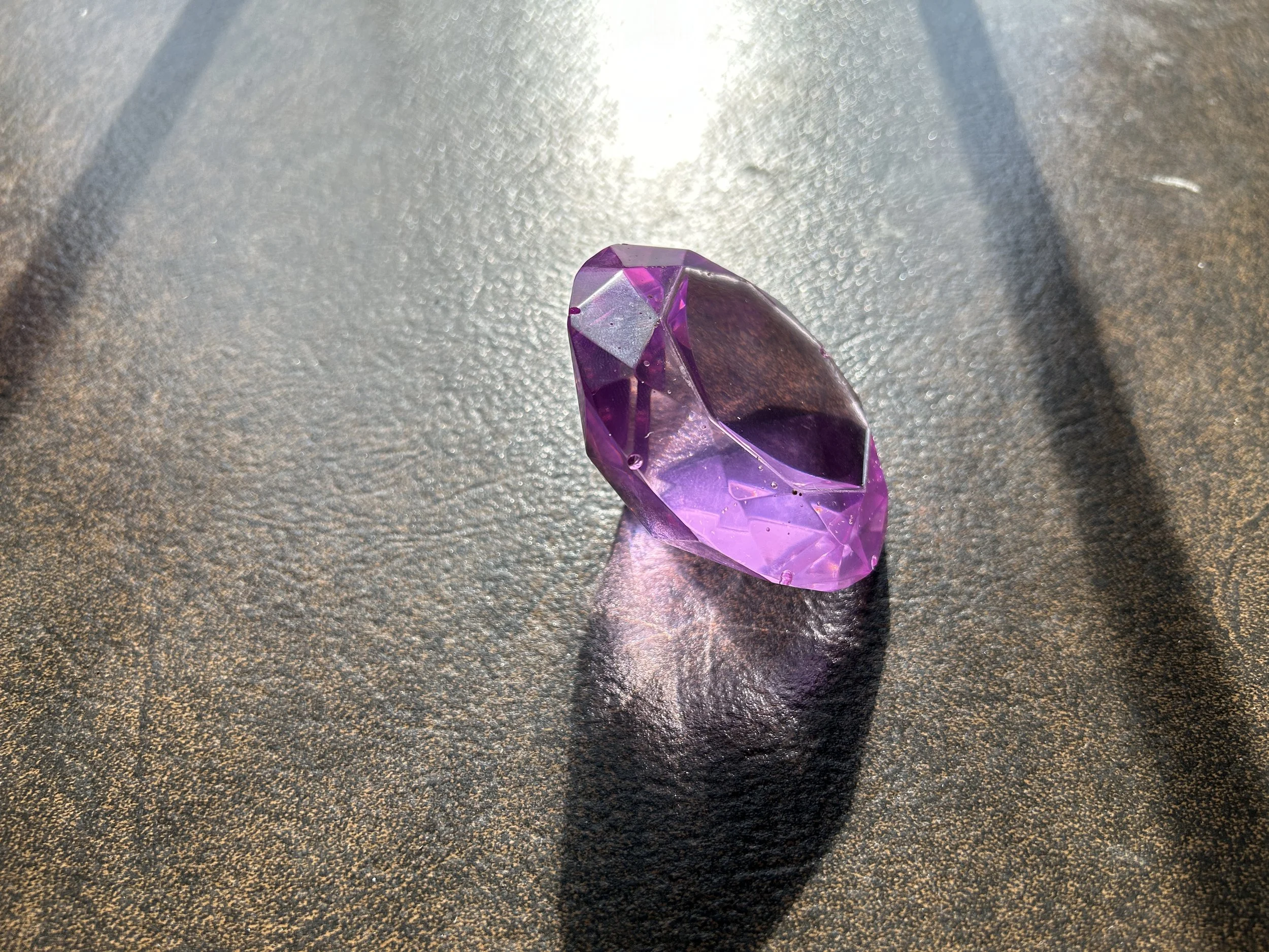 This exquisite resin gem captures the eye with its vibrant purple hue, a color often associated with royalty and mystique. The faceted design cleverly plays with the light, creating an array of reflections and depth that give the appearance of a precious amethyst. Its angular cuts and polished surface mirror the expertise of a skilled gem cutter, ensuring that each face acts as a window into the gem's complex inner world. Bathed in sunlight, the gem throws prismatic patterns on the surface it rests upon, hinting at the intricate play of light and color that could only be achieved through careful pouring and curing of the resin. The gem's shadow, cast by the natural light, further accentuates its clear, sharp edges and the flawless execution of its form. This resin gem is not just a tribute to the natural beauty of real gemstones but is also a testament to the artistry possible with resin crafting. It's a stunning piece that could easily become the centerpiece of a jewelry design or serve as an ornamental object that brings a touch of elegance and sophistication to any space. Lg Gem- light purple--Item#130
