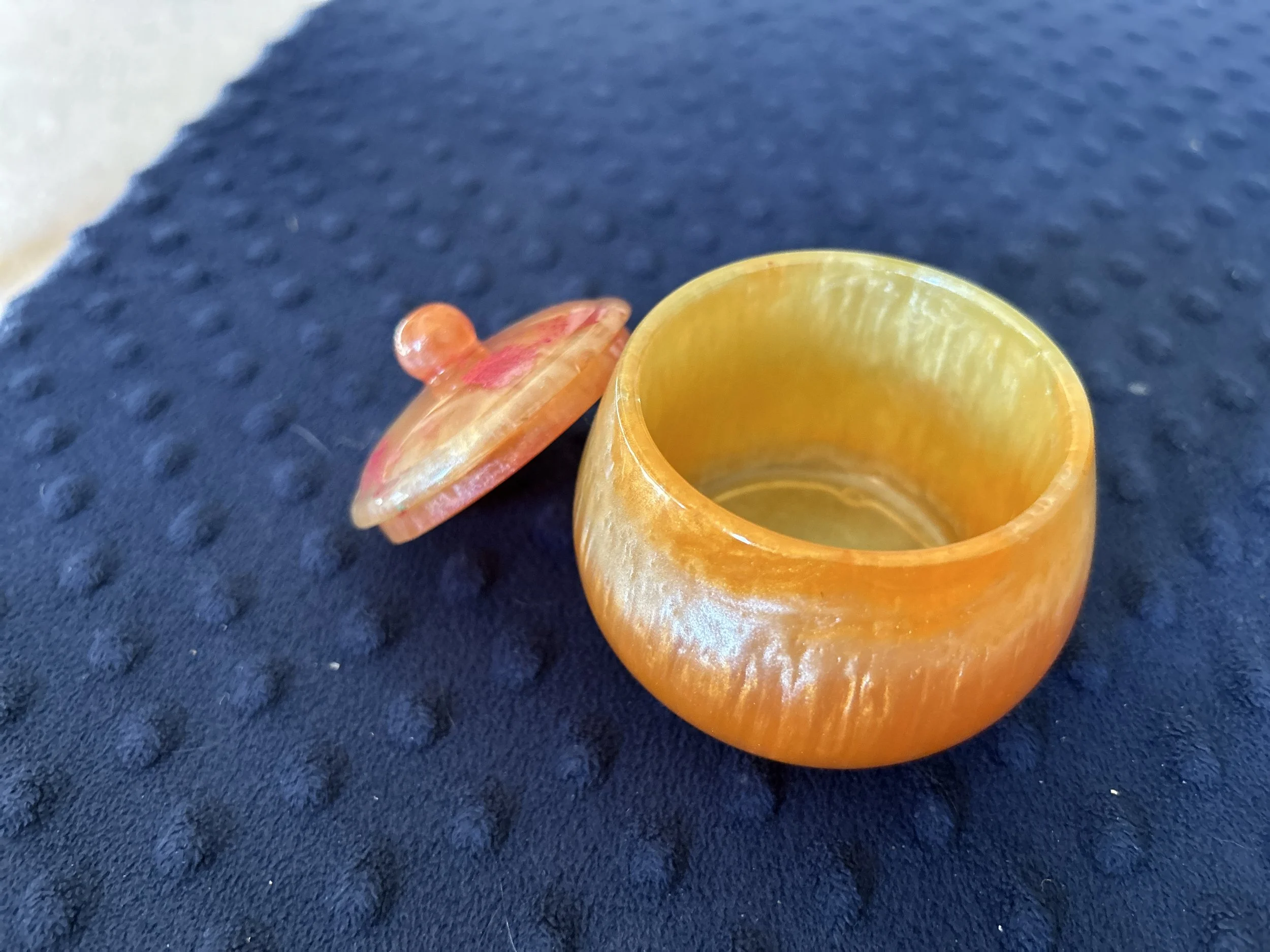 This resin jar is a delightful combination of functionality and whimsy, featuring a warm and inviting color palette. The jar itself boasts a sunny, translucent amber that resembles honey or golden syrup, with a gradient that deepens into a rich, marmalade orange at its base. This warm spectrum of colors is reminiscent of autumnal hues and evokes a cozy, comforting atmosphere. The lid of the jar is an artwork in itself, with playful swirls of pink and orange that suggest the bright colors of a sunset or a twirling candy. The knob on the lid is both practical and aesthetically pleasing, positioned like a small jewel atop the jar. When off, the lid reveals the smooth interior which is just as polished and inviting as the exterior. Sitting against the contrasting blue fabric background, with its textured dots, the jar's colors seem to pop even more vibrantly. It's easy to imagine this charming piece sitting atop a kitchen counter, holding sweet treats, or as a decorative container for keepsakes on a bookshelf. The jar encapsulates the joy found in small, beautifully crafted objects that brighten up everyday spaces. 3in Jar- orange w/ pink--Item#110